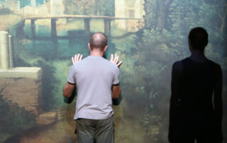 Il sipario si apre invece ancora una volta – come una nota ostinata – sulla Tempesta di Giorgione a cui Anagoor ha dedicato in passato altri lavori. Una grande riproduzione della tela del pittore di Castelfranco, primo e fulminante “paesaggio” della storia dell’arte, campeggia priva delle tre figure umane: senza l’uomo con l’asta e senza la donna nuda con il bambino, resta unicamente l’orizzonte della città turrita e deserta immersa e sovrastata dalla natura. Puro paesaggio, eppure non pura natura. L’orizzonte e la visione della natura sono irrimediabilmente mediati, filtrati, contagiati, corrotti dalla cultura. Galateo e bosco. Antinomia per eccellenza: il divario e le derive generate da questa tensione hanno implicazioni psichiche, etiche, politiche. E quando il terremoto apre la faglia, la psiche frana e la lingua si spacca. Alcuni poeti come sismografi sanno farsi antenna.