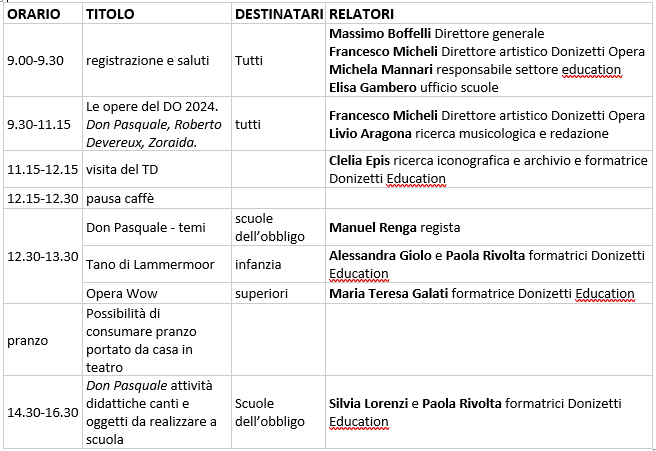 Per questo per l’anno scolastico 2024/2025 la Fondazione Teatro Donizetti ha deciso di proporre una giornata intensiva di formazione unificata, rivolta a tutti gli insegnanti di ogni ordine e grado, con lo scopo di fornire nozioni e strumenti didattici a tutti gli insegnanti che intendono allargare il loro interesse all’opera e a Gaetano Donizetti. Il corso fornirà nel contempo suggerimenti per poter trasmettere alcune competenze agli studenti.